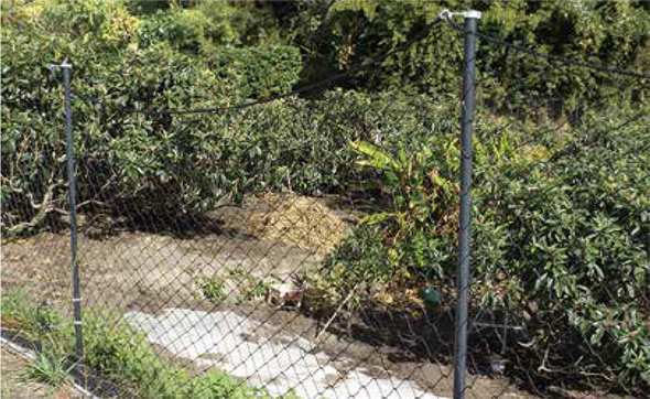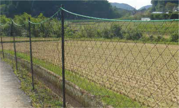 ステンレス線入りサル用ネットです。通電部分を+とーに分けて使用します。 サルがネットを登り、+の部分とーの部分に同時に触れることで、ショックを受けます。 支柱は必ずFRPポールを使用してください。